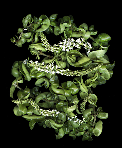 Green leaves, stems of white curly Lysimachia and a black marble combine to form the Dragon.