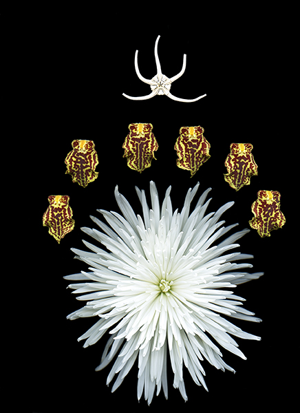 A Fuji Mum, the bodies of 'Guilded Tower' hybred orchids and a small spiny seashell form the mystery of the Key.