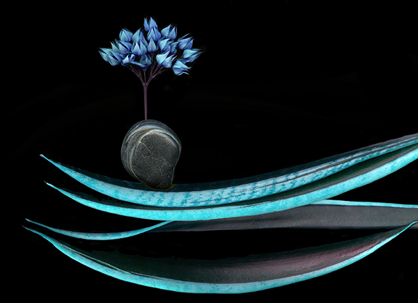 Sansevieria leaves form a floating island as viewed at midninght by a passing sail boat.