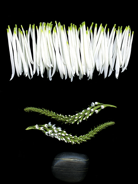 Stems from a Fuji Mum, two strands of Lysimachia and a sacred black stone offer a welcome greeting.