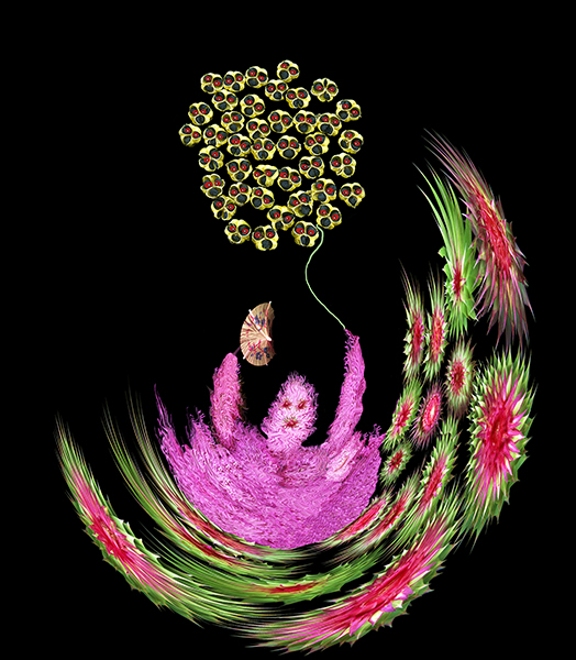 flowers, holding a sun umbrella and a balloon of shrunken heads (Allium).