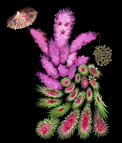 Dancer (thistle) holding an umbrella and a basket of souls (Allium).