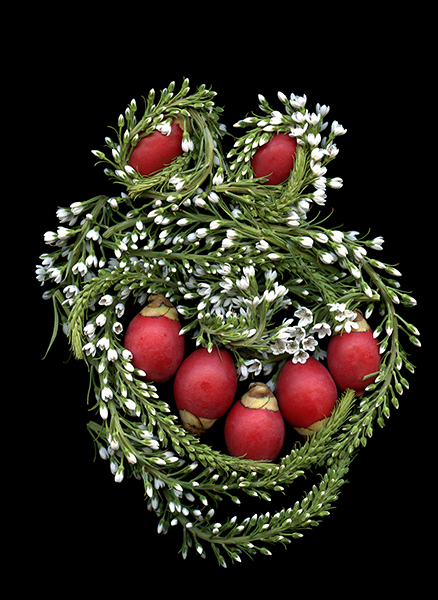 White Lysimachia forms Coco's face with red Palm tree nuts for teeth.