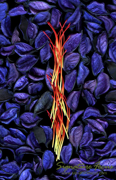 Stems from a Pincushion Protea laying on a bed of dyed shells.