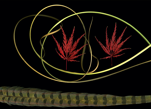 A combination of yellow-green ornamental grass, pheasant feather and the red color of a Japanese maple leaf.