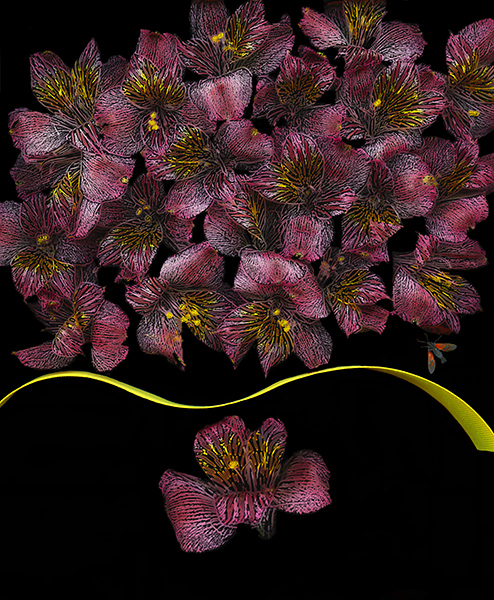 Asthumeria flowers treated as drawn with a color pencil. Honey bee and Yellow ribbon