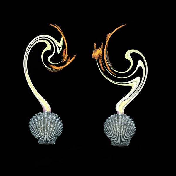 Combined and twisted Lily stamen resting on seashells.