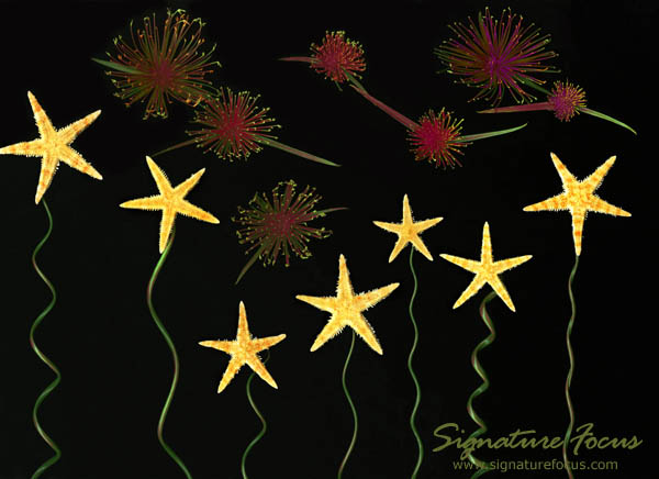 The night sky with fireworks provided by starfish, and the tops of Papyrus plants.