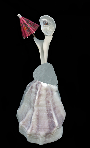 Large oyster shell (skirt), nautilus shell, Oyster shell head. Eye is as was found embeded in the shell. Red Parasol added for color.