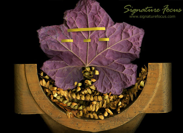 Still life of a embellished leaf.