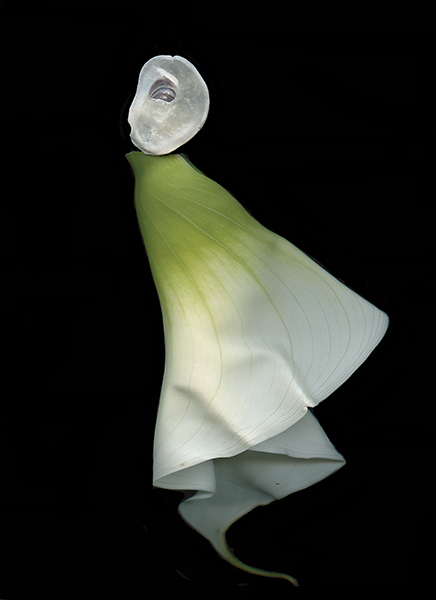 Upside down Calla Lily dress with a oyster shell head. Eye is unretouched.