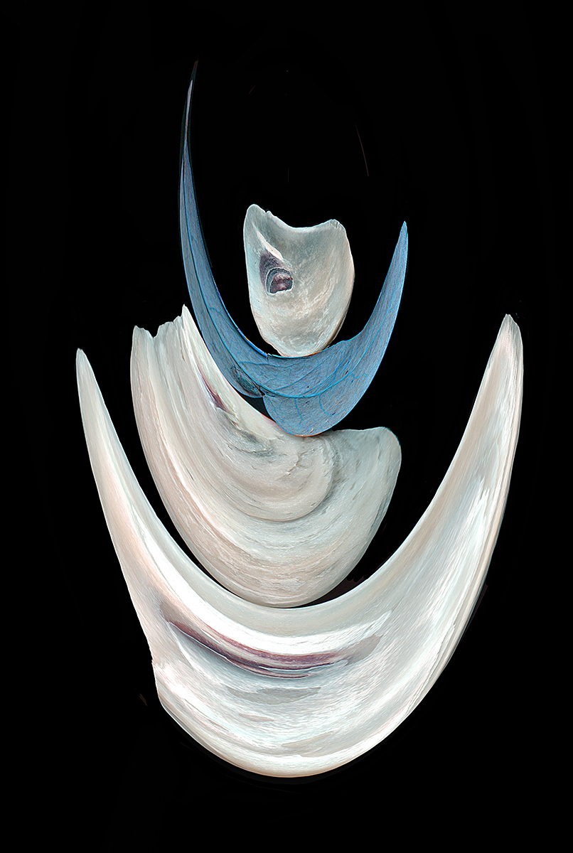 Scaled, twisted and stacked oyster shells. One shell colored blue.