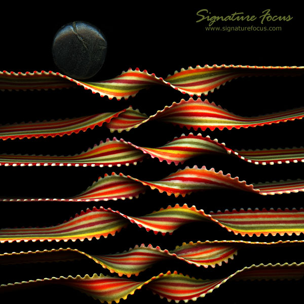 | What better way to remember Italy then with wonderful pasta. I used rainbow colored Lingua Di Suocera or in English “Mother in Law's tongue”, lined with barbs, to set the stage and one of my wonderful black stones to set the mood for a sultry dark morning over Sorrento. |