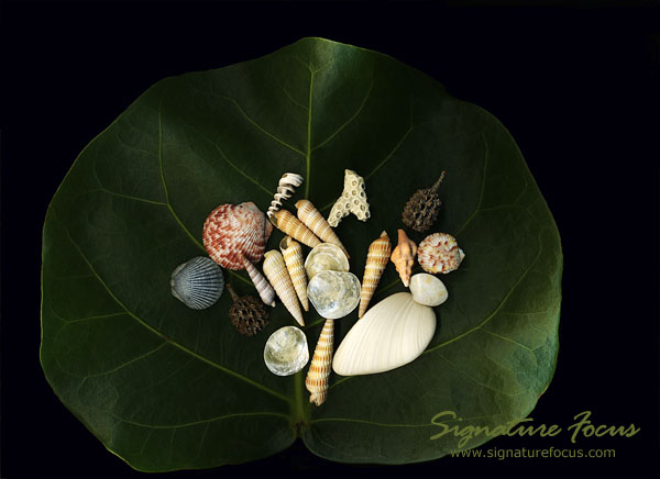 Sea Grape Leaf holding beach shell and other treasures from a morning treasure hunt.