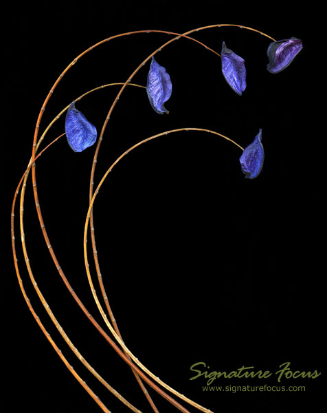 Naturally curving stems from a royal poinciana tree host blue nut-shell "flowers"