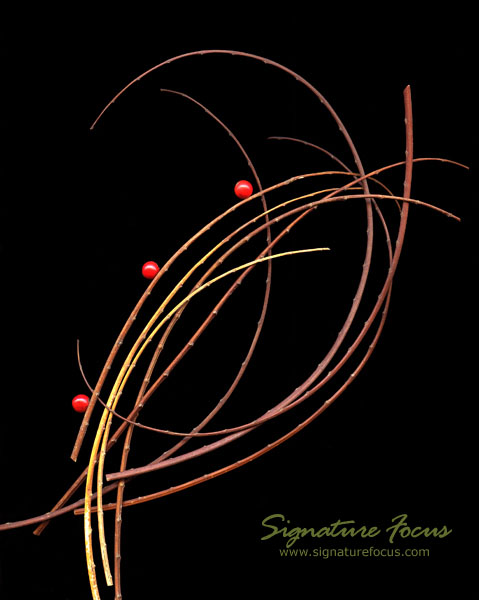 Curving stems from a Royal Poinciana tree balance red berries in a contemporary design