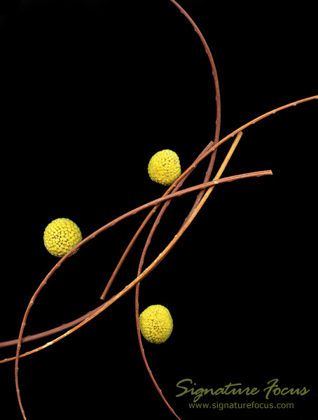 Yellow puff balls from a Tamarindillo tree balance on stems from a Royal Poinciana tree
