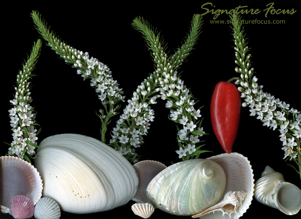 Red pepper resting on a field of sea shells against a back drop of Lizard's Tail flowers