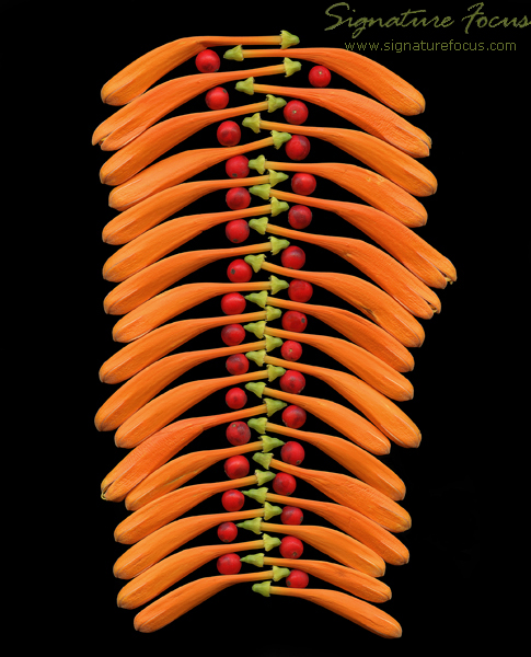 Flaming trumpet flowers photographed just prior to emerging from their casing. The red berries were found on a bush nearby. The design was inspired by Native American ceremonial breastplates.