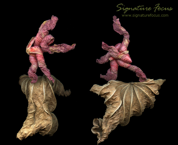 Super heroes’ battle for supremacy. The super heroes were developed from Hibiscus flowers. Each figure is standing on a Dioscorea leaf.
