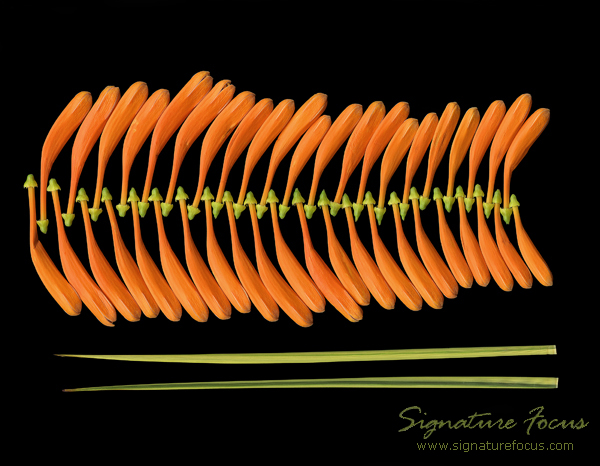 Flaming trumpet flowers photographed just prior to emerging from their casing. The two palm leaf strands suggest a roadway into the streets of orange.