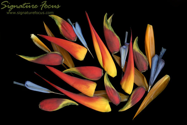 Colorful parts of a number of tropical plants including the "Bird of Paradise" and a Heliconia plant (whose genesis includes "lobster-claws" and "False Bird of Paradise.)