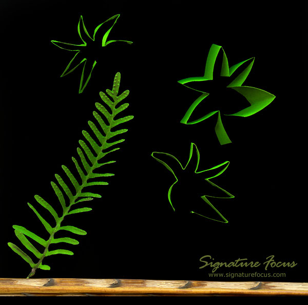 Tree formed with a fern. Stars are paper cutouts. The yellow base is from a palm tree branch.