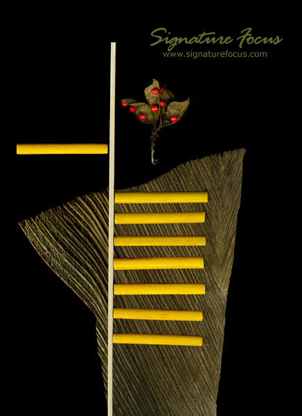 Palm tree wrap, sections of palm branch and a leaf with suspended red berries.