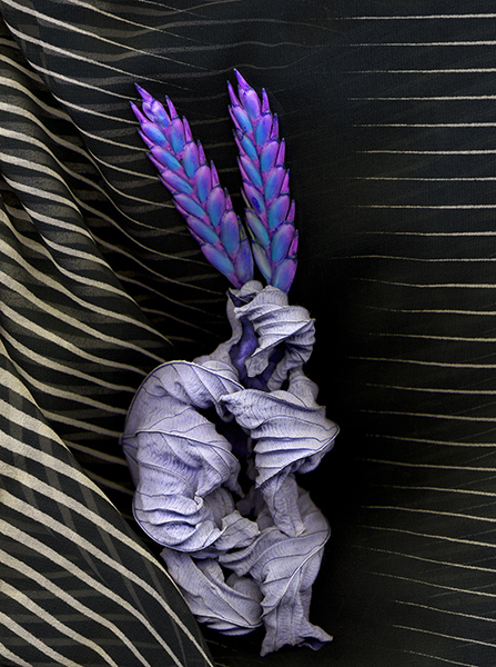 Cecropia leaf takes on the shape of a native American ceremonial dancer, silk stripe background, (blue hue). Headdress is a bloom of a Tillandsia (Air Plant)