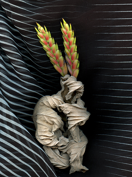 Cecropia leaf takes on the shape of a native American ceremonial dancer, silk strip background. Headdress is a bloom of a Tillandsia (Air Plant)