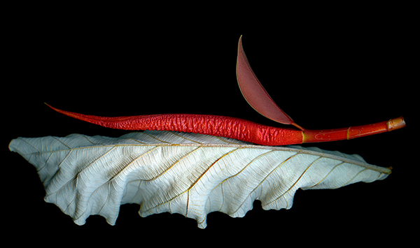 Red stem of a Ficus Elastica (Rubber Plant) resting on a Cecropia leaf