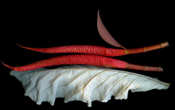 Two Red stems from Ficus Elastica (Rubber Plant) resting on a Cecropia leaf