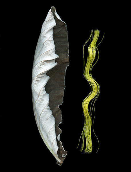 Dried Cecropia leaf and a piece of yellow nylon rope found on the beach
