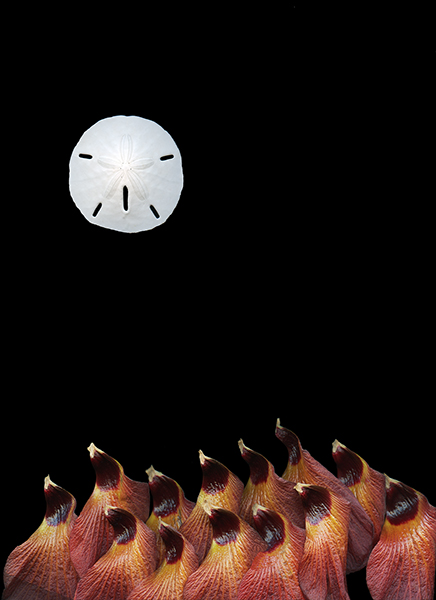 Petals of Seaside Mahoe flower separated and turned upside down to form the look of curious island birds observing a full moon (Sand Dollar sea shell)
