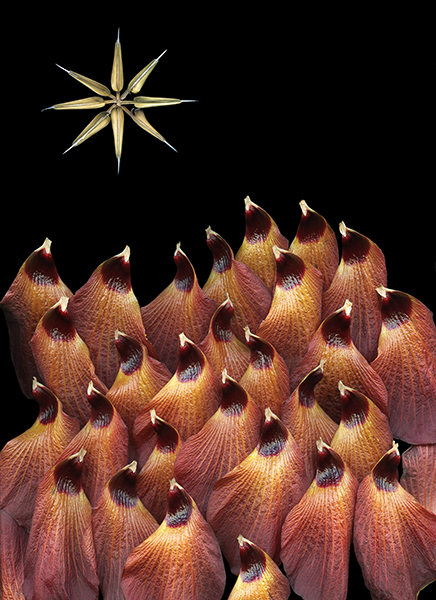 Petals of Seaside Mahoe flower separated and turned upside down to form the look of curious island birds observing the North Star (Blue tongues of a Bird of Paradise plant