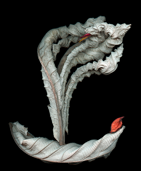 Dried Cecropia leaves with a nut shell