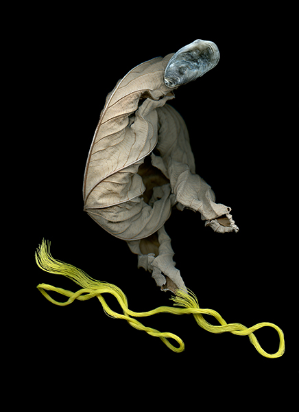 Dried Cecropia leaf forms the body while a sea shell acts as the head and a piece of yellow nylon rope found on the beach makes a perfect skiboard