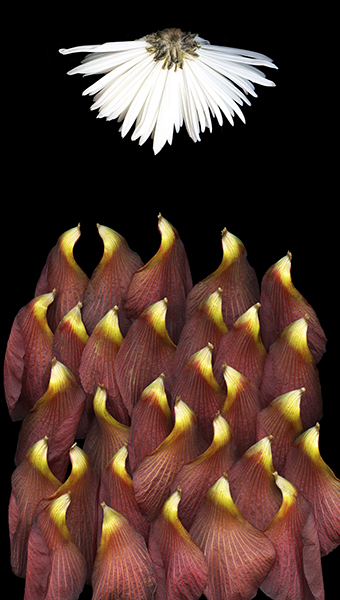 Petals of Seaside Mahoe flower separated and turned upside down to form the look of curious island birds searching for "the Answer" -split Chrysanthemum Flower