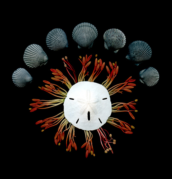 Dark baby Scallop shells, red Stamen from an Alstroemeria flower and a white sand dollar shell