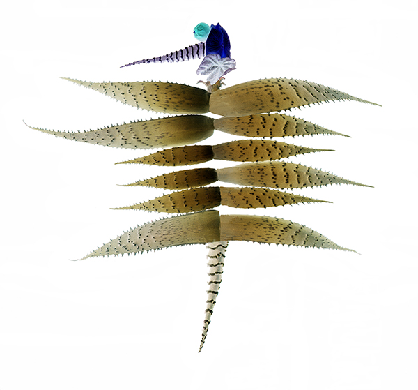 Aloe stems form the body, Haworthia succulent tail and beak, white rose bulb the head, and red berry eye.