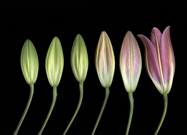 A Lily plant blooms. Found several plants and staged the photo to look like time lapse photography