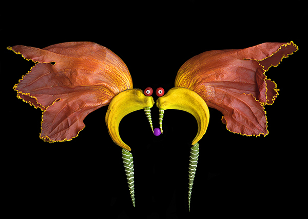 Pieces and parts Seaside Mahoe flowers with pincers and leg stems of Haworthia Fasciata and red berry eyes