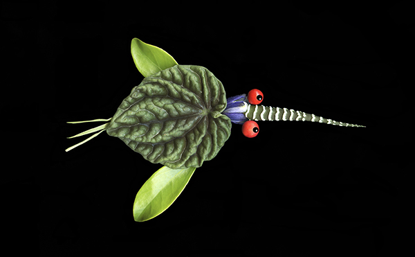 Fanciful birds body is a peperomia Caperata tail feathers from a split Alice DuPont Mandevilla, and the beak from a Haworthia stem.