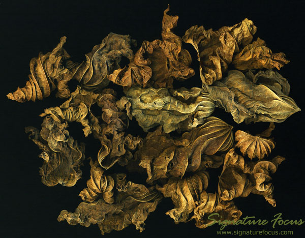 | I discovered a hanging vine of dead Dioscorea leaves. Each leaf is like a work of art presenting itself for inspection. I clipped the vine at both ends and took the leaves to my studio. Half disintegrated in the transfer process. This photo has all the possible leaves left to use in making the photo. |