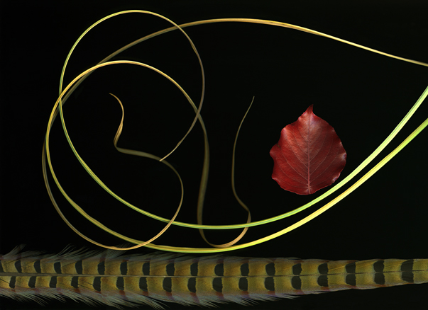 A magical combination of yellow-green ornamental grass, pheasant feather and the brilliant fall red color of a single leaf. When I laid the second stalk of grass down on the first it magically curled itself around the edges of its partner. No further adjustments were ever made to the design of the photo. |