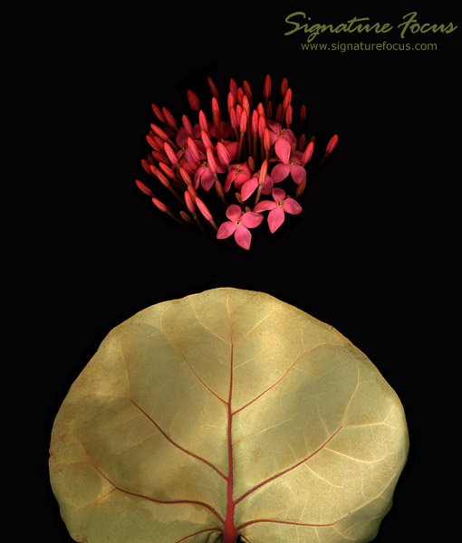 Just off a Florida beach on a cloudless blue-sky afternoon I spotted this beautiful sea grape leaf just entering its golden age. Combined with the contrasting bright red of a small spray of flowers it serves as my memory keeper for that afternoon. |