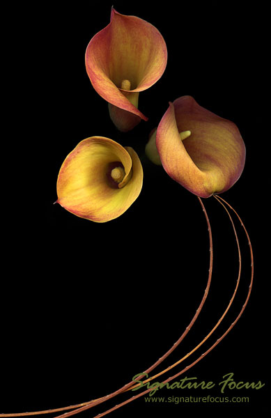 Sweeping curves of Royal Poinciana stems balance three calla flowers
