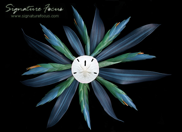 Bromeliad Blooms and Draceana Warneckii Leaves with saturated color.